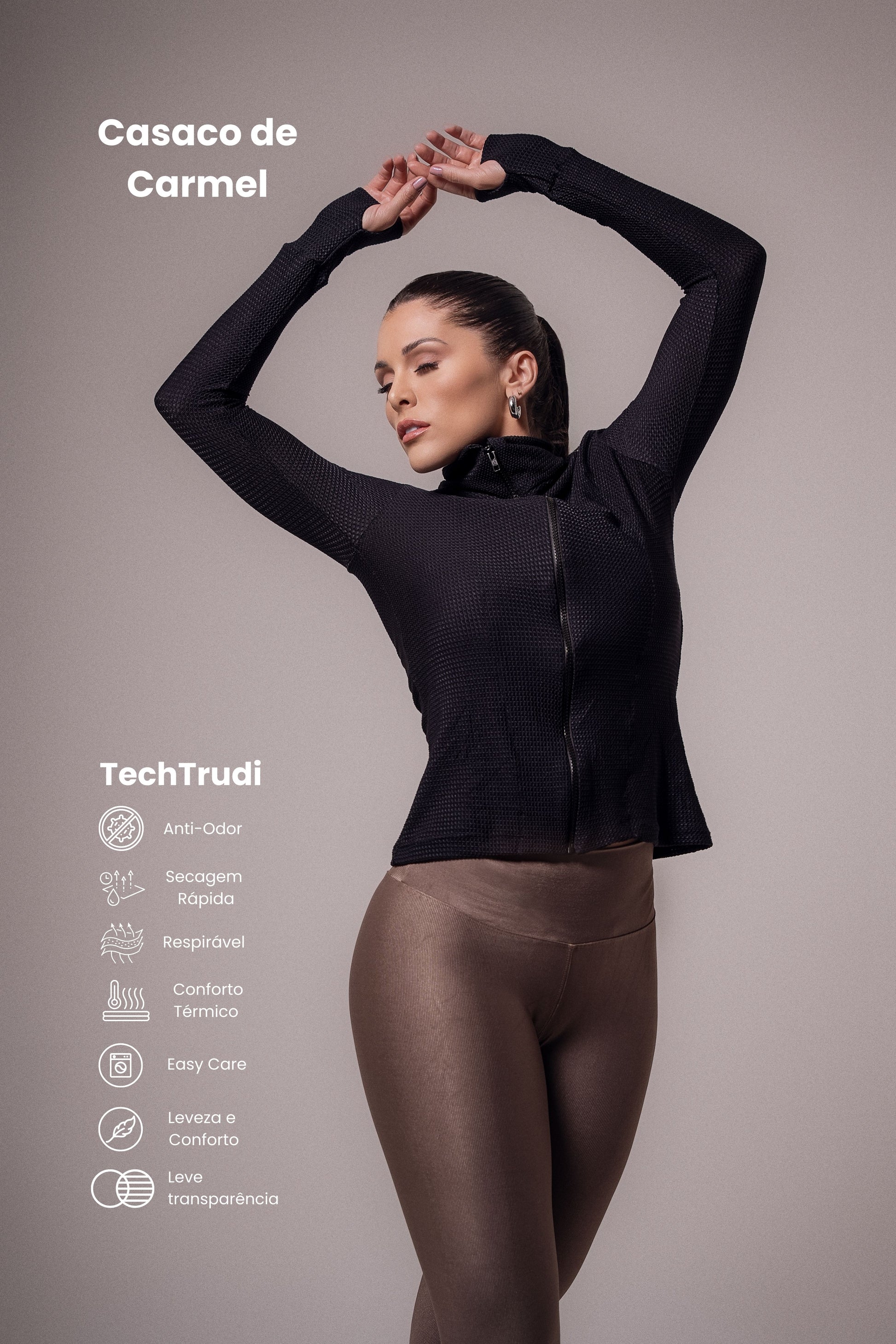 Confeccionado em tecido Carmel com poliamida, ele proporciona um toque suave e um ajuste confortável que valoriza a silhueta. O zíper Trator garante praticidade e um visual moderno. Com um design que alonga visualmente, este casaco é a escolha ideal para quem busca sofisticação sem abrir mão do conforto.